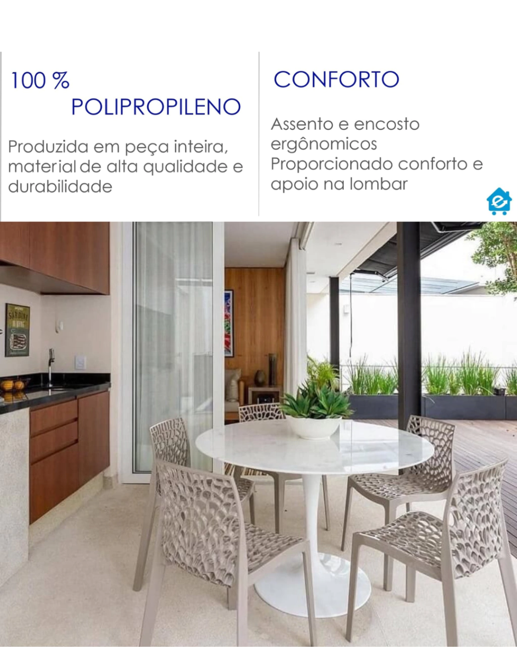 As Cadeiras Gruvyer se destacam pelo design inovador e estrutura vazada, que combina leveza e robustez. Fabricadas em polipropileno de alta qualidade, são ergonômicas, fáceis de limpar e resistentes ao uso diário, oferecendo conforto e estilo para qualquer ambiente.