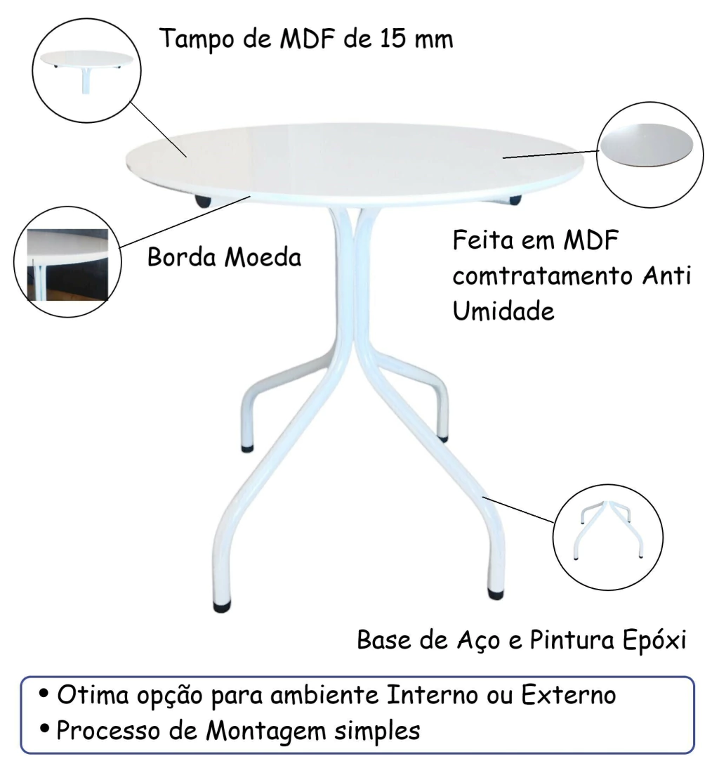 A Mesa Moema possui tampo redondo em MDF de 15mm com tratamento antiumidade, garantindo maior durabilidade e fácil manutenção. Sua base em aço com pintura epóxi eletrostática proporciona resistência, estabilidade e um acabamento sofisticado. Compacta e versátil, essa mesa se adapta bem a cozinhas, varandas, bistrôs, lanchonetes e estabelecimentos comerciais.