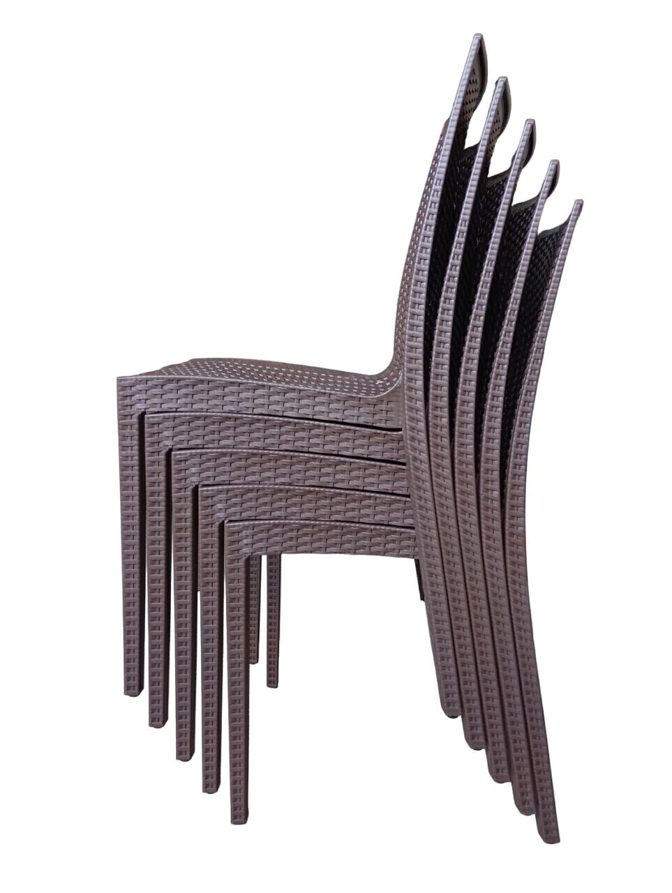 Com um encosto tramado que remete ao clássico rattan, essa cadeira combina charme rústico com um toque moderno. Seu formato ergonômico garante conforto mesmo em longos períodos de uso, enquanto sua estrutura sem braços facilita a organização em espaços reduzidos.