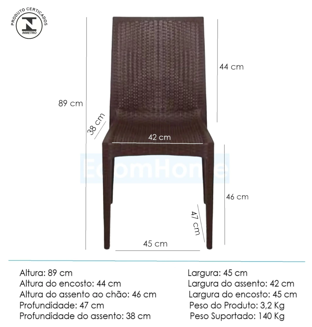 Fabricada em polipropileno injetado de alta qualidade, a Cadeira Rattan é resistente a impactos, umidade e variações climáticas. Seu material não desbota com a exposição ao sol, garantindo durabilidade e conservação da cor por muito mais tempo.